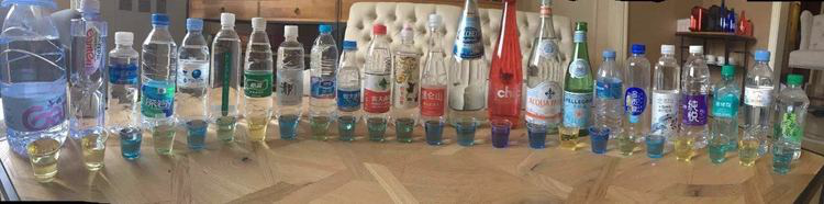 圖中,市面上常見的飲用水都用PH試劑溴百里酚藍(lán)做了檢測,顏色各不相同。一般還配上這么一句話: